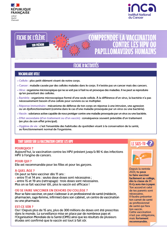 Fiche de l’élève « Comprendre la vaccination contre les HPV »