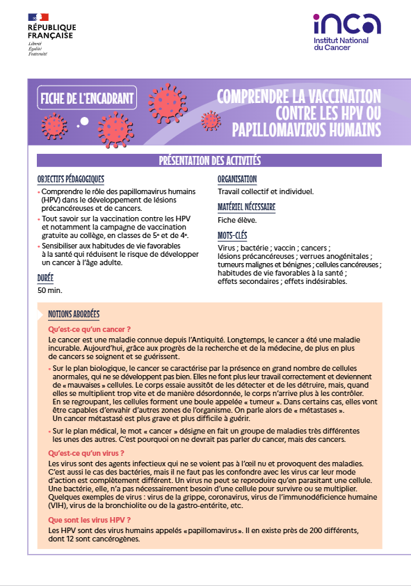 Fiche de l’enseignant « Comprendre la vaccination contre les HPV »
